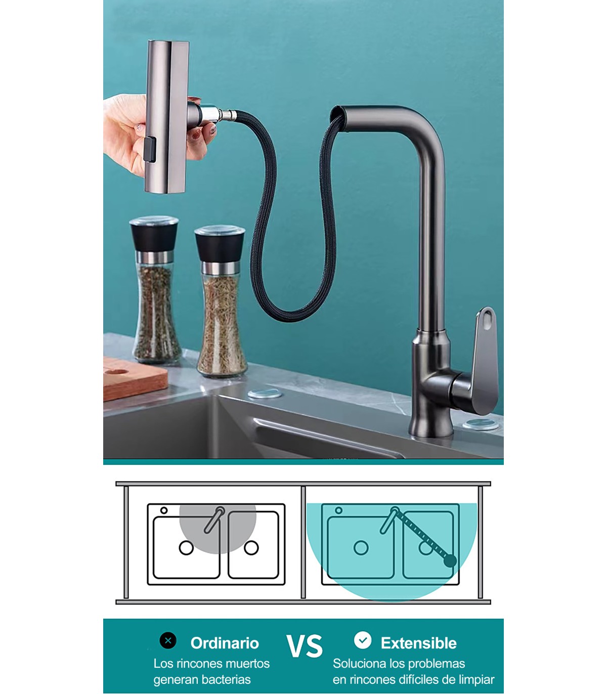 - 360º ROTATING FAUCET: Pull-out, suitable for kitchen, sink, and basin.