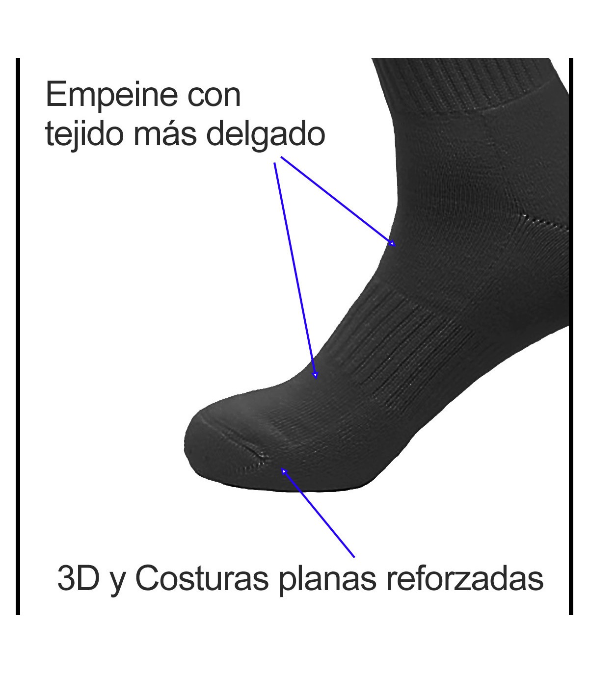 Las finas costuras evitan rozaduras en dedos, talón y puños. El empeine cuenta con tejido más fino para máxima ventilación y una banda elástica central para un mejor ajuste.