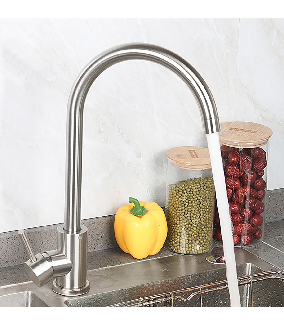 Fabriqué en acier inoxydable 304, sans plomb et sûr pour l’alimentation. La finition brossée donne un aspect moderne et évite traces et rayures. Dans des conditions d’eau très dure ou d’humidité constante, de petites taches d’oxydation superficielles peuvent apparaître, facilement éliminées par frottement doux, gardant le robinet impeccable.