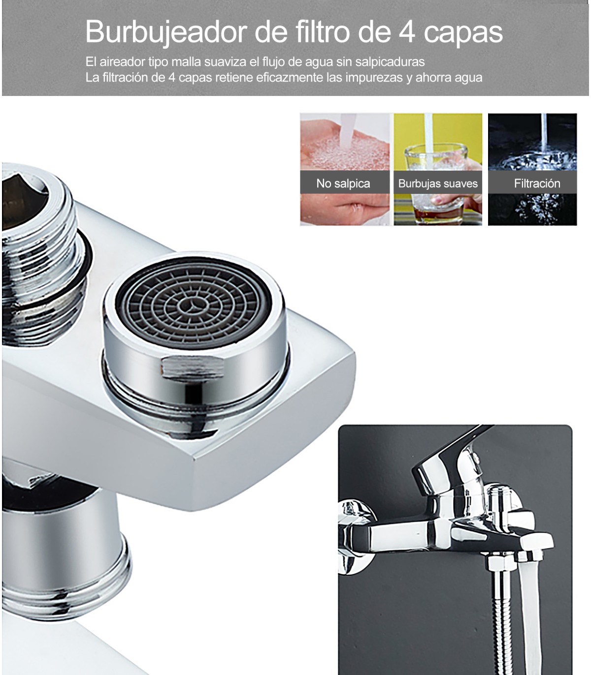 - EENKOPSKRAAN: Gemaakt van antibacterieel, antischimmel verfijnd koper, keramische kern, mallaerator en omleider voor douchefunctie.