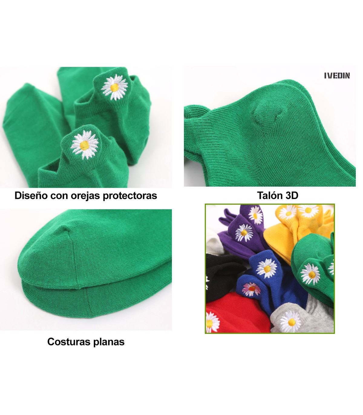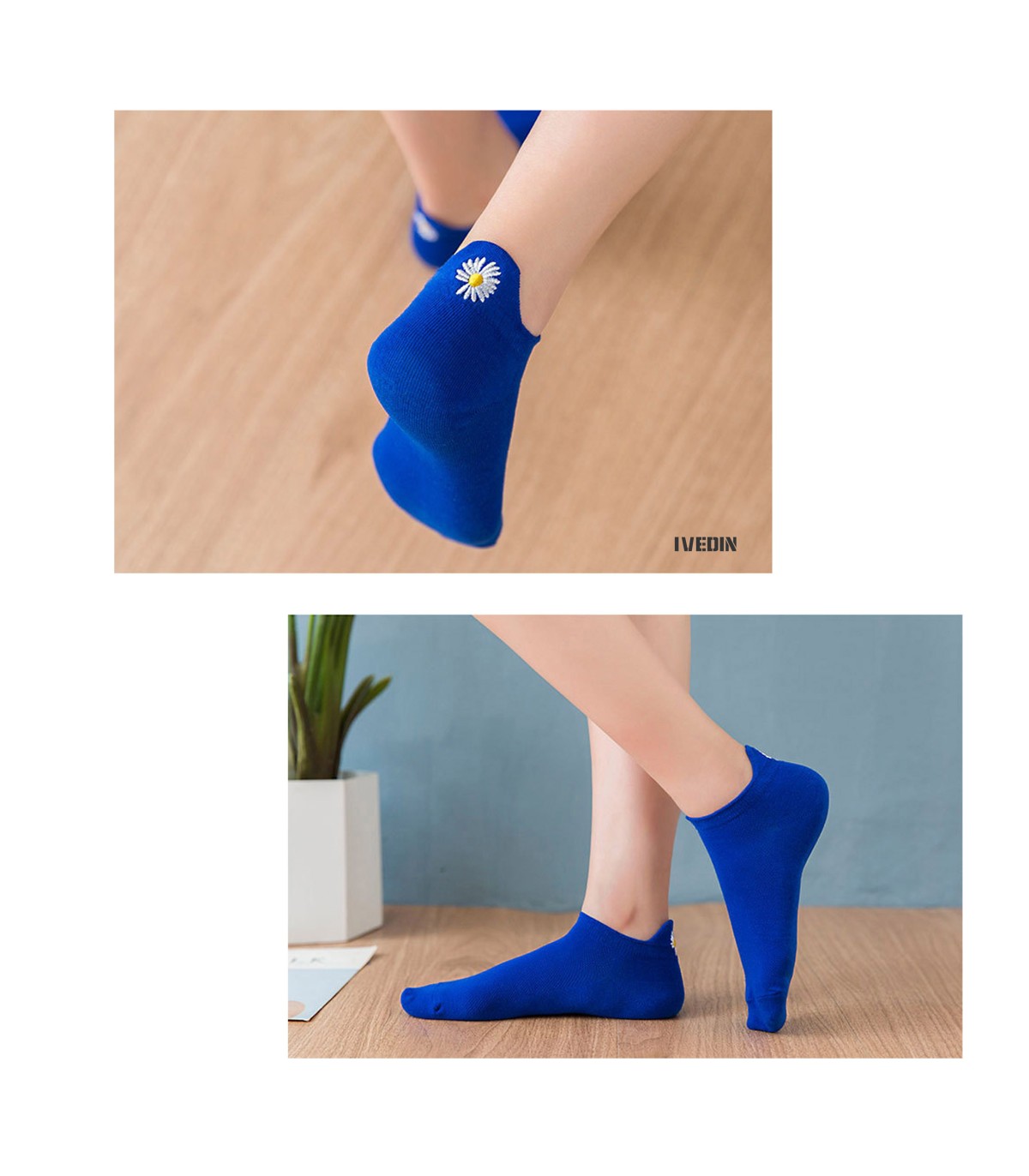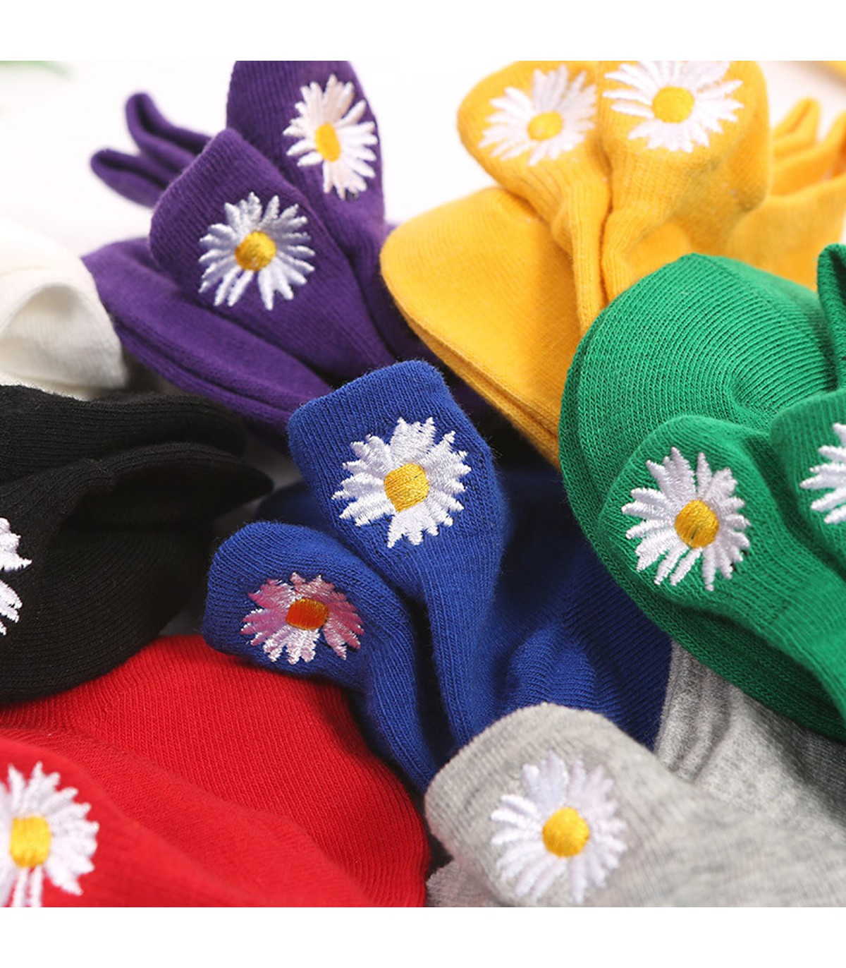 RÓŻNORODNOŚĆ KOLORÓW: Zestaw 8 par w radosnych i świeżych kolorach, z każdą parą ozdobioną haftowaną stokrotką w okolicy ścięgna Achillesa, nadającą unikalny i elegancki wygląd.