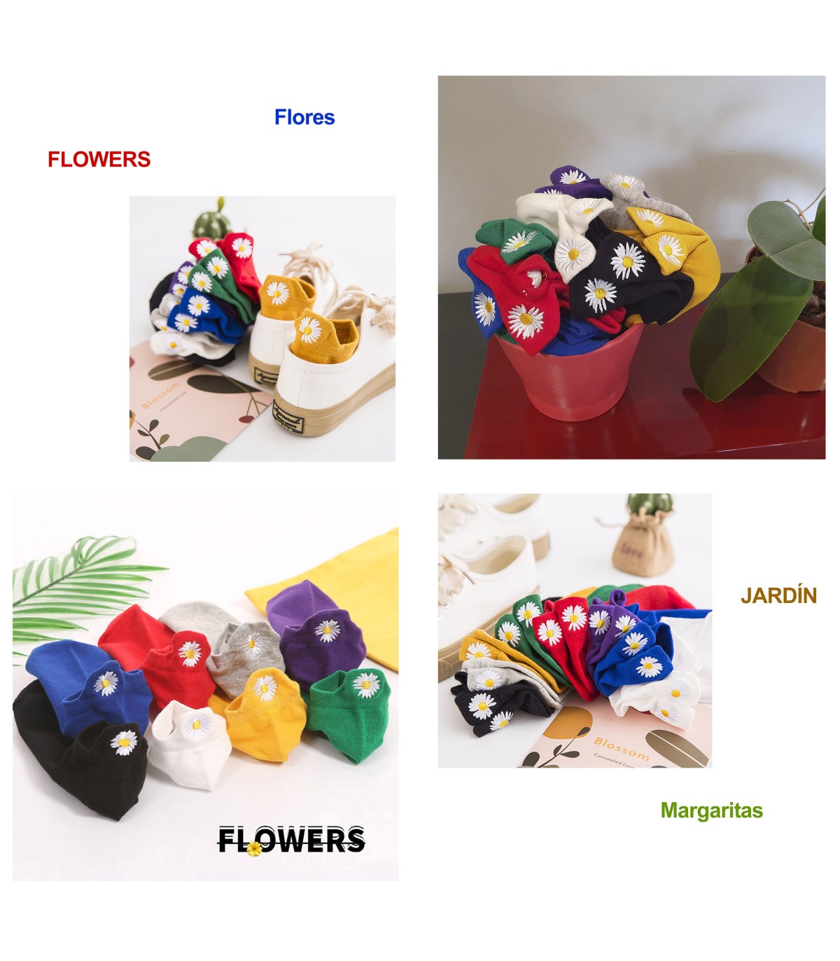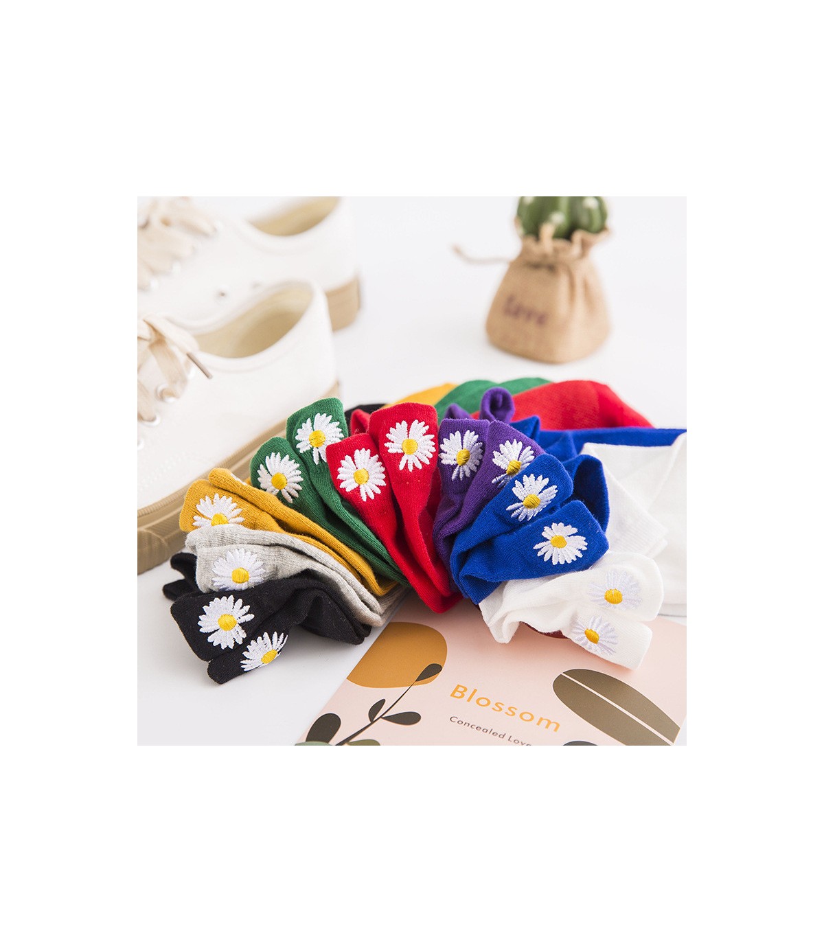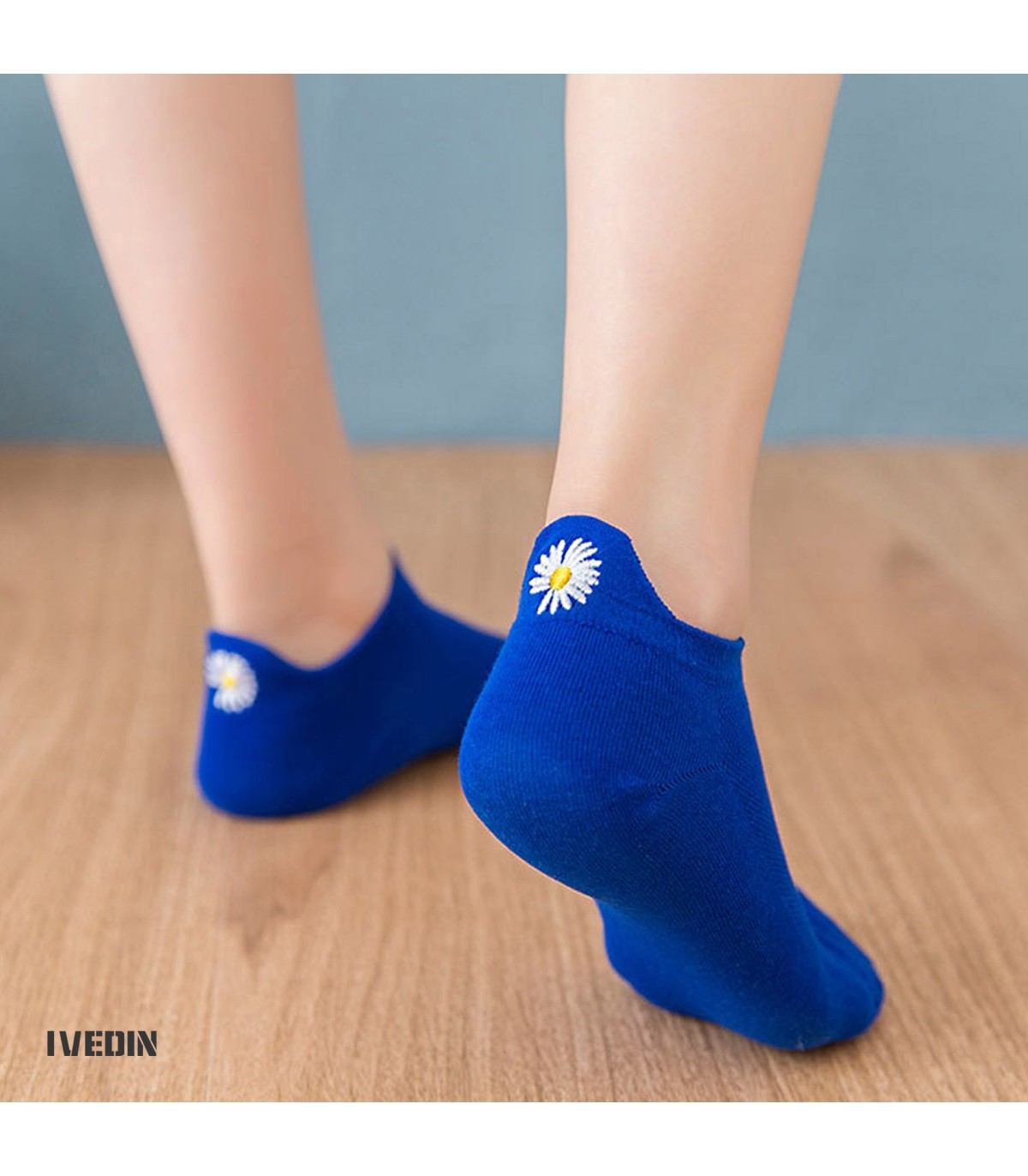 RÓŻNORODNOŚĆ KOLORÓW: Zestaw 8 par w radosnych i świeżych kolorach, z każdą parą ozdobioną haftowaną stokrotką w okolicy ścięgna Achillesa, nadającą unikalny i elegancki wygląd.