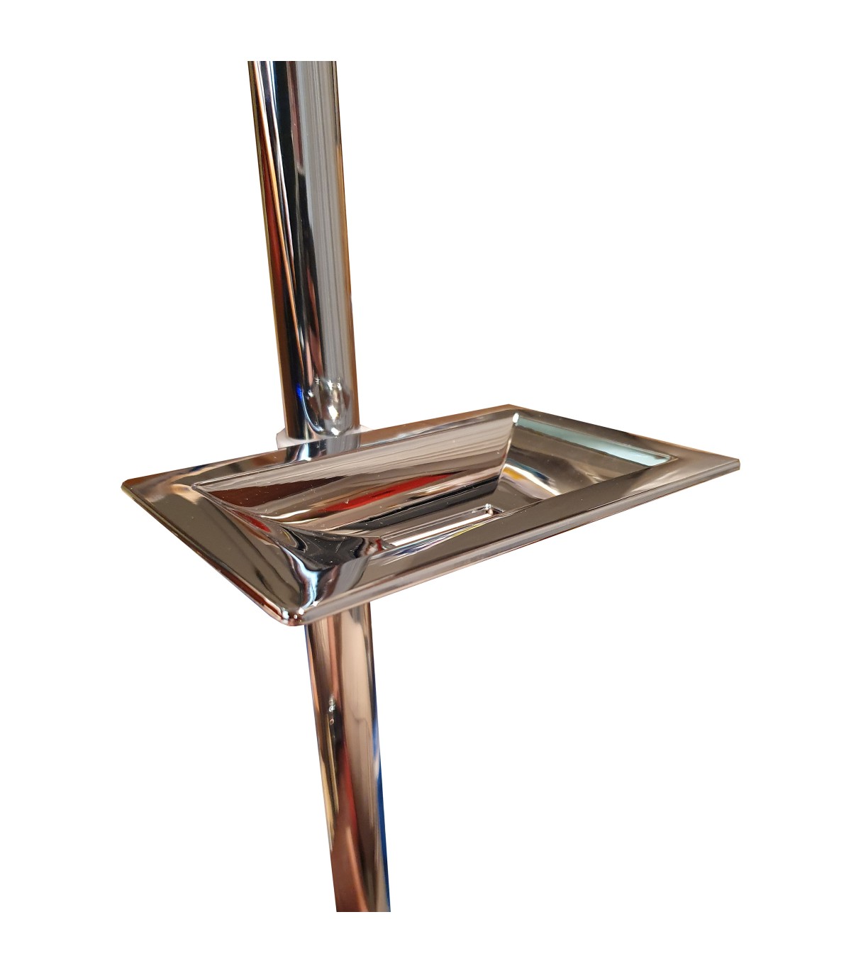 Inclui uma prateleira em plástico grosso, alta resistência, acabamento cromado brilhante. Prática para colocar produtos de higiene como géis, champôs ou esponjas, mantendo-os sempre acessíveis durante a ducha.
