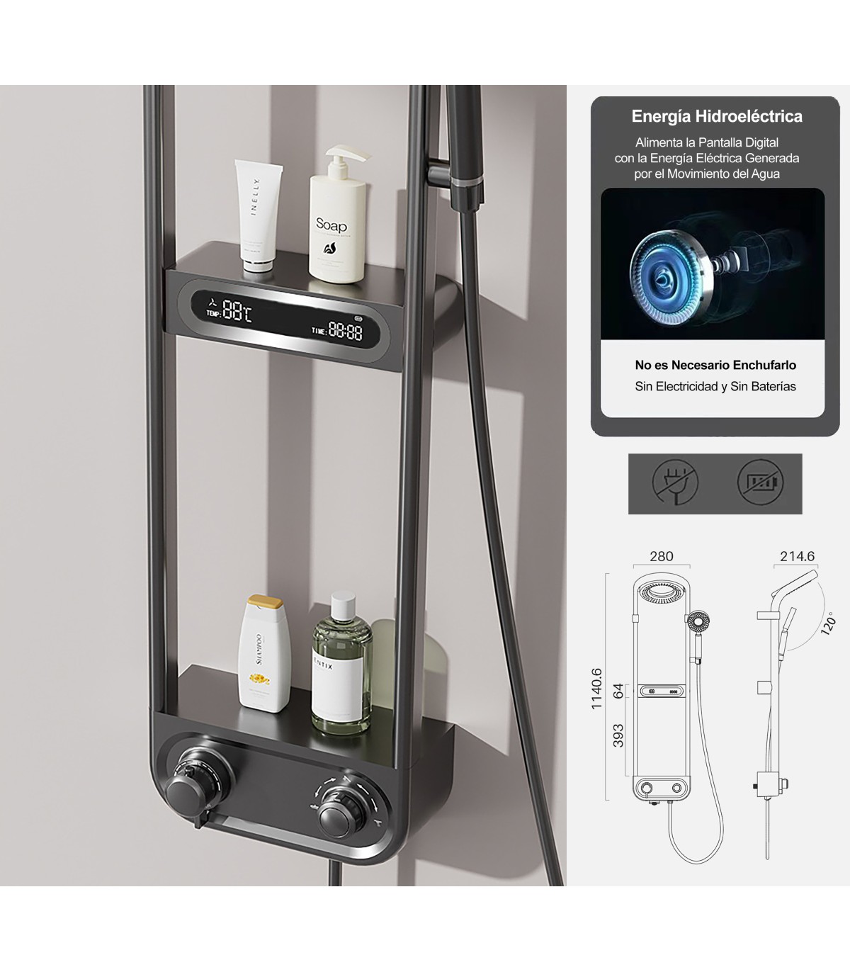 Um dos seus elementos mais destacados é o display digital integrado, que mostra em tempo real a temperatura da água e a hora. Funciona através de um gerador hidroelétrico ativado pelo fluxo de água, sem necessidade de pilhas ou ligação elétrica, tornando-o num sistema prático e ecológico.
