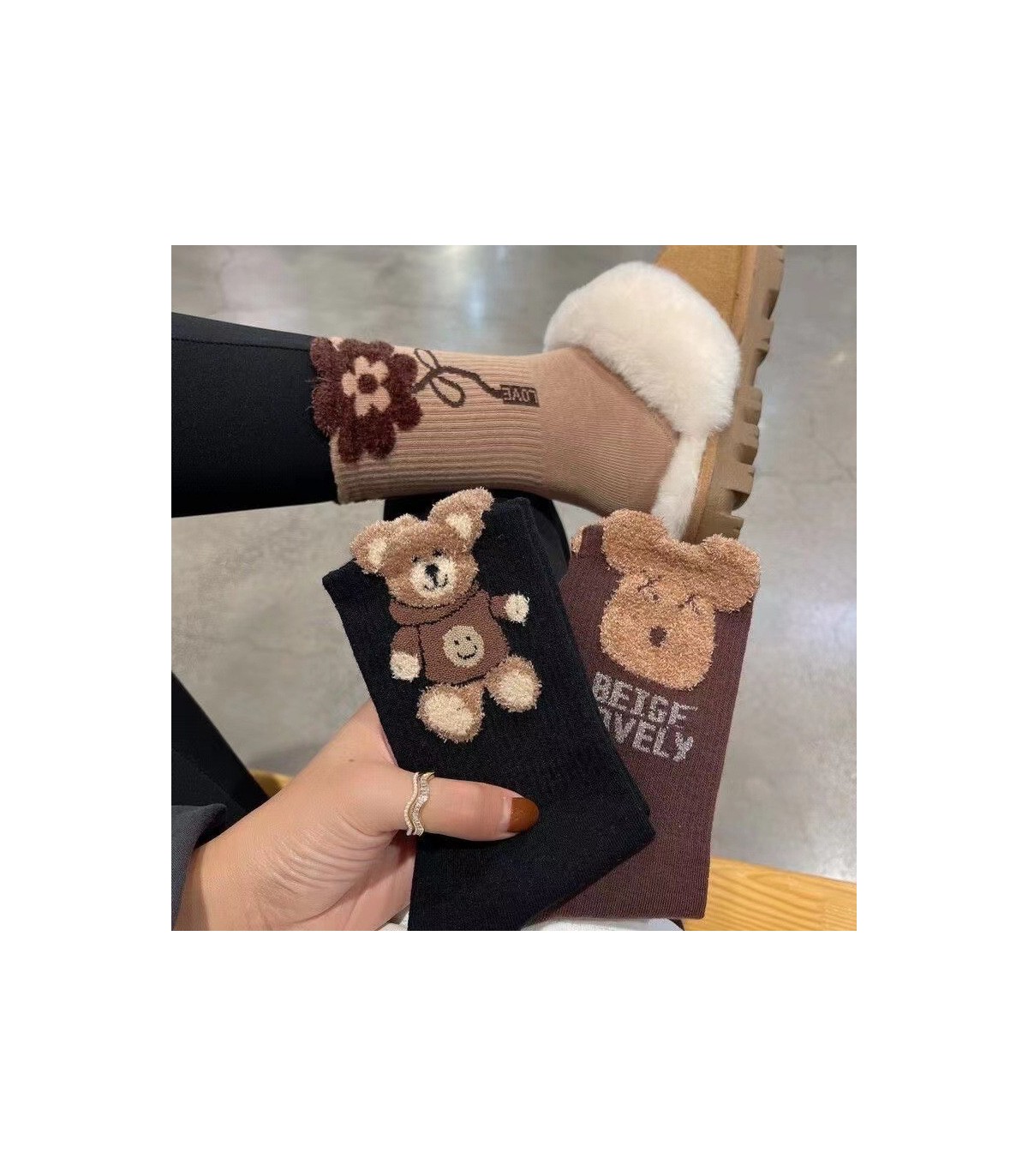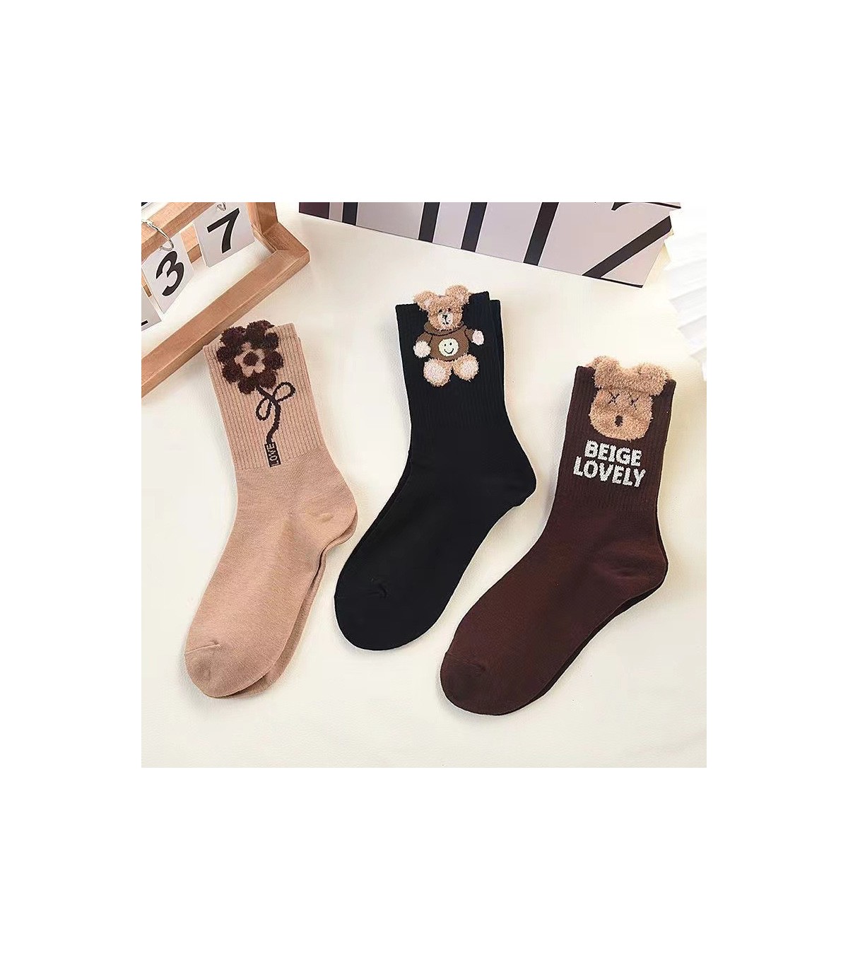 Estas meias destacam-se pela decoração com motivos tridimensionais de bonecos macios e fofos, adicionando um toque alegre e único, tornando-as um presente especial e memorável.